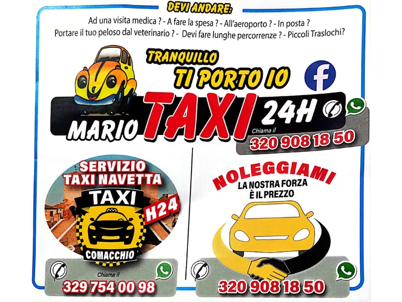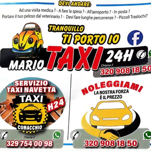 Se stai cercando un servizio di taxi navetta h24 ai Lidi di Comacchio, Taxi Ti Porto Io! di Mario Cavalieri è la scelta ideale per soddisfare le tue esigenze di mobilità in qualsiasi momento del giorno e della notte. Il signor Mario offre servizio di trasporto puntuale e professionale, disponibile 24 ore su 24, per spostamenti locali o viaggi più lunghi. Che tu abbia bisogno di un trasferimento da e verso il tuo hotel, una corsa per raggiungere i principali punti di interesse turistico della zona, o un collegamento rapido con le stazioni e aeroporti vicini, garantisce un viaggio comodo e sicuro.